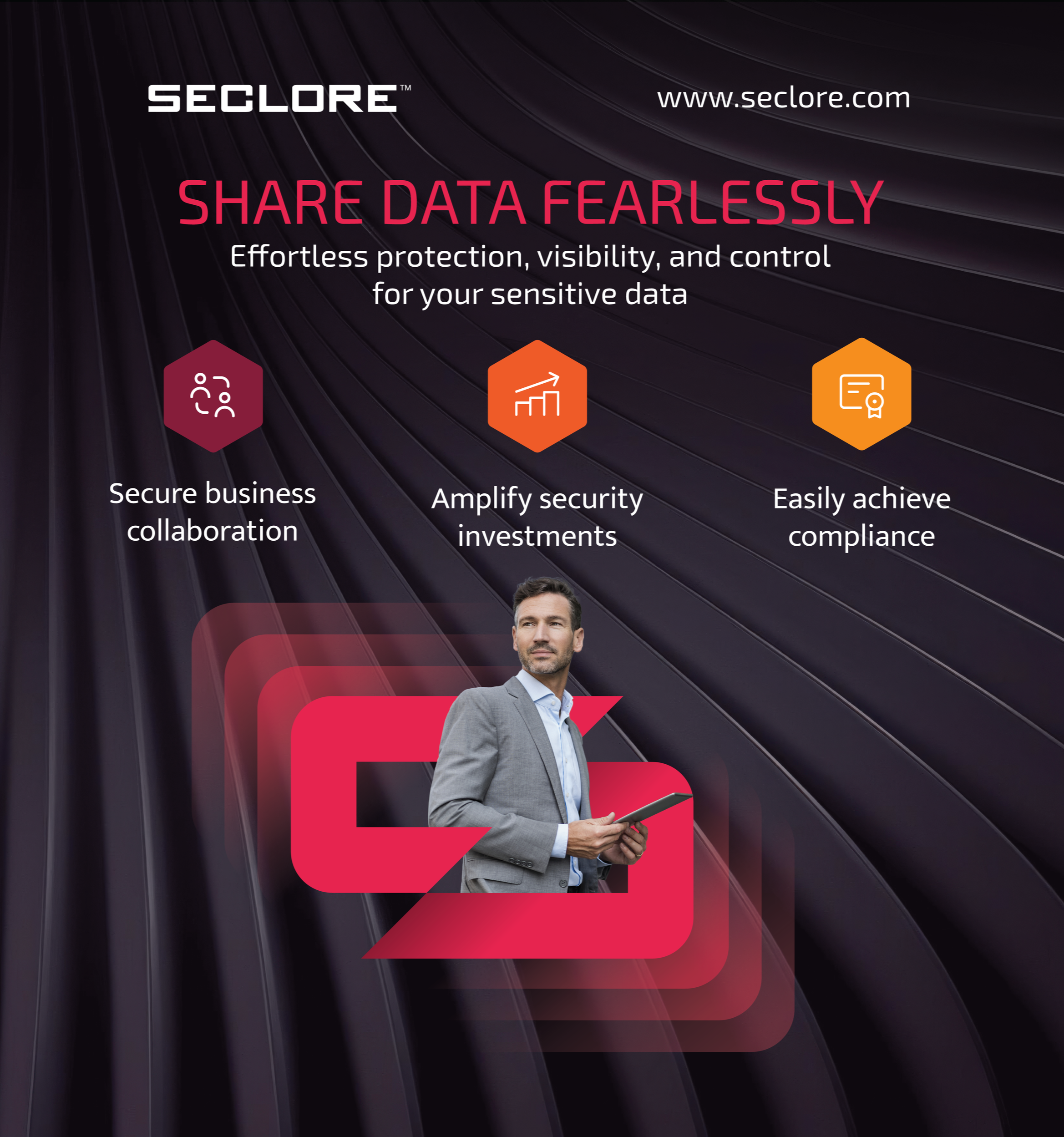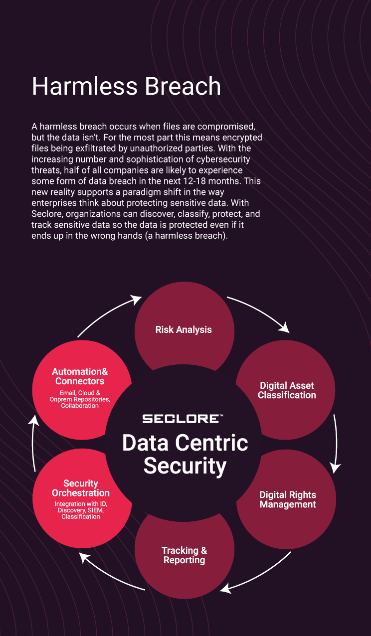 For the below booth banner, “Harmless Breach”, I was tasked with updating Seclore’s Data Centric Security graphic to better visually represent how their unique security system works. The graphic was then used for various marketing materials both in printed and digital formats.