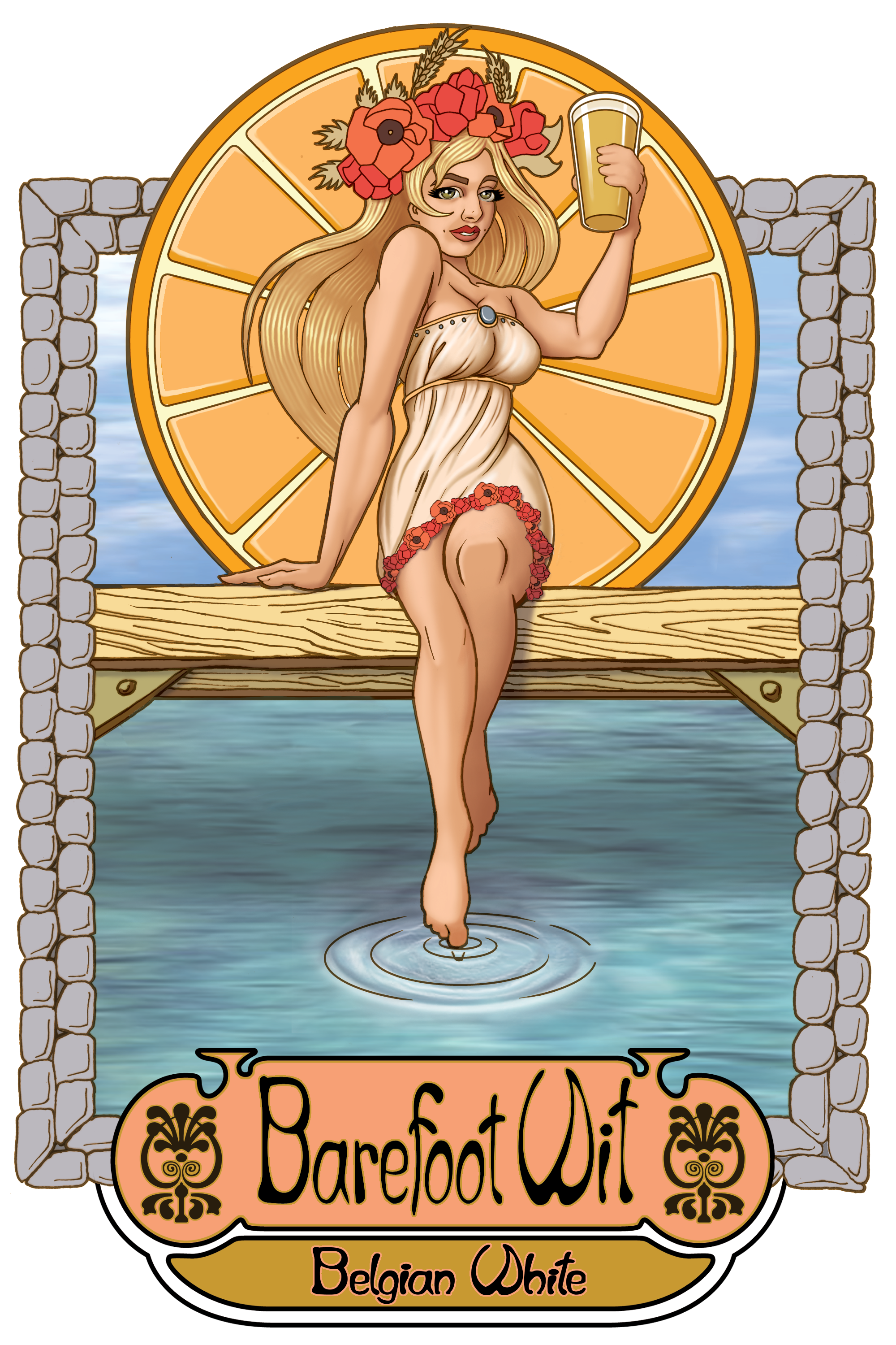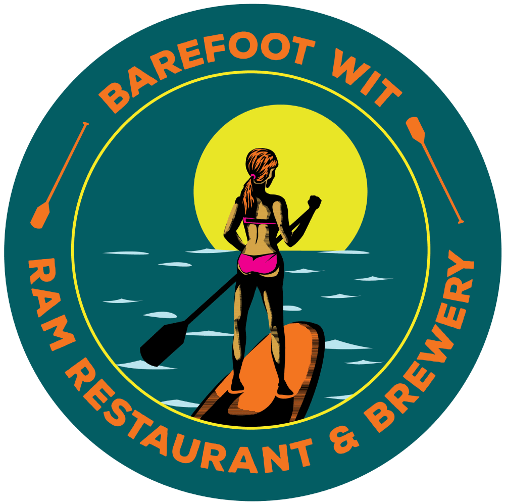 The Ram was wanting to redesign their existing Barefoot Wit logo, moving away from the art nouveaux-style, and drawing design inspiration from the 1966 movie poster, Endless Summer, but keeping the female figure to call back to the original logo and adding a paddleboard to make it feel more Pacific Northwest.
