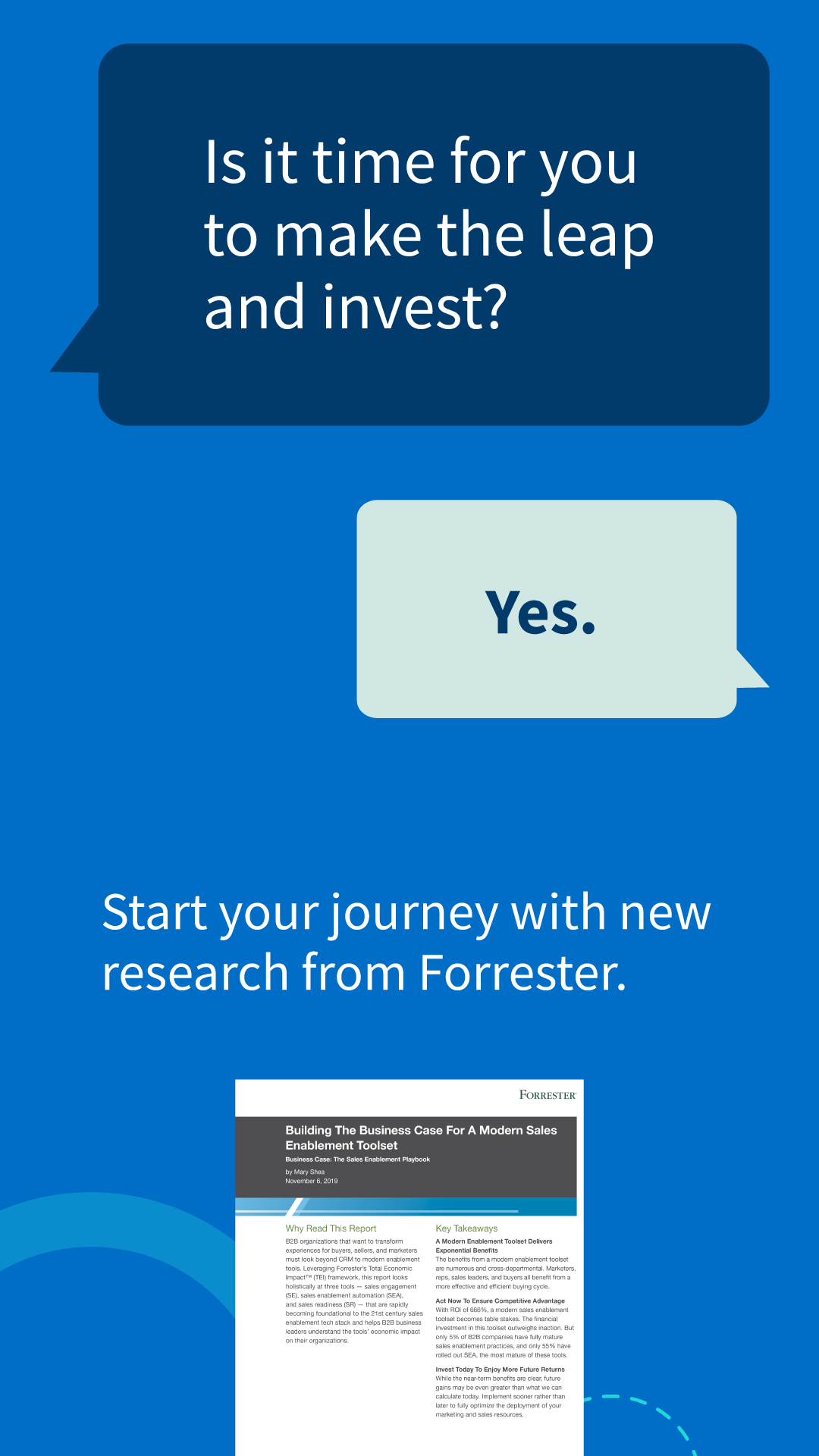 Highspot’s brand is clean and simple, without overwhelming the consumer. I didn’t want each screen to be static with all of the information already provided, so I broke some of the data up so it would appear through each click; one collection appears as a texting conversation. Ideally, we wanted the reader to eventually click on the Forrester link, pictured below.